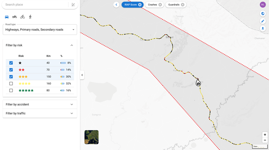 iRAP's Star Rating methodology uses a predictive, risk-based approach to assess roads universally by reviewing attributes present along the road corridor. The time-consuming traditional method of conducting an iRAP Star Rating involves accredited coders manually reviewing video footage of road, 100m at a time, and coding more than 50 road attributes. These attributes are then processed through iRAP's ViDA software to get an objective star rating measure of the level of safety for vehicle occupants, motorcyclists, cyclists, and pedestrians. To scale this process, iRAP launched AiRAP in 2019, which stands for the "accelerated and intelligent" capture of road safety data. Learn more about AiRAP at: www.irap.org/airap.